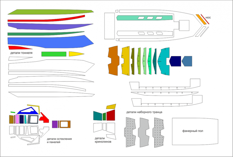 В проект входят два основных файла в форматах .dxf (Autocad) и .cdr (CorelDraw) с деталями катера в натуральную величину и картинки с сопряжением деталей. Для сварки деталей экструдером сделаны припуски шириной 12мм, после сварки эти припуски можно зашлифовать ушм или сточить ручным фрезером.