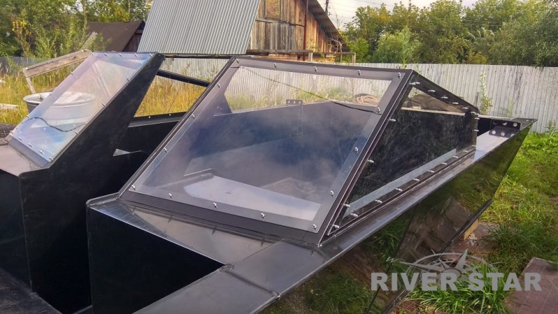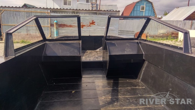 Безкапотная компоновка позволяет грузить достаточное количество груза в переднюю часть кокпита и перевозить до 5 человек в пассажирской части катера. Небольшая килеватость катера обеспечивает малую осадку, а листы ПНД толщиной 12мм, из которых сделано днище катера, надежно защищают от ударов о камни. На катере смело можно "выбрасываться" на каменистый берег, чего точно нельзя делать на лодке со стеклопластиковым корпусом.